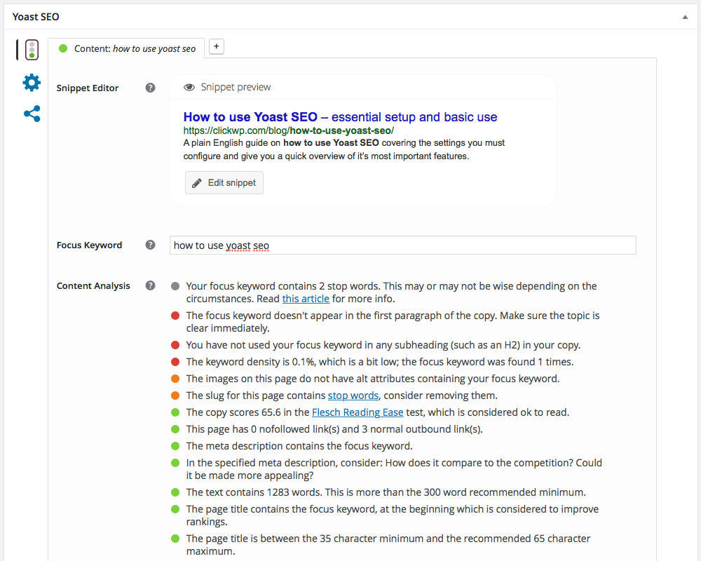 If you look at Content Analysis, Yoast SEO runs a quick check of your post for SEO best practices based on your focus keyword. Take all these recommendations as a very rough guide, and keep in mind that you should always write for the end user, not specifically for search engines. That said, usually these are best practices for SEO particularly because they also help the user. Look at the page analysis for ideas, but also look at your post with a critical eye towards what a user searching would be looking for and how you can answer their question.